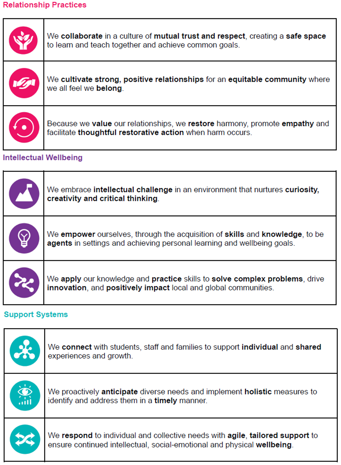 At the heart of our community is a shared commitment to Wellbeing, creating a culture of mutual trust and respect where we can learn and teach together. We aim to provide a safe space to achieve common goals through the integration of three foundational aspects: Relationship Practices, Intellectual Wellbeing, and Support Systems.